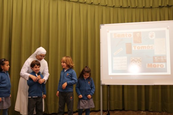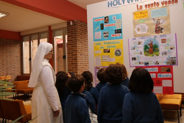 San Miguel Arcángel, San Francisco de Asís, San Martín de Tours, Santo Domingo Savio, San Francisco de Sales, Santo Tomás Moro, San Benito de Nursia, Santa Cecilia y Santa Hildegarda, patrona de la medicina natural, han sido los protagonistas de este día en el que todos los alumnos han podido conocer, gracias a lo trabajado en casa por compañeros y familias, lo que estos santos suponen de modelo de fe, bondad y amor por sus semejantes.